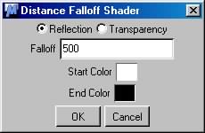 This channel shader fades the transparency or reflection of an object based on distance. For example, the object will reflect object that are within the falloff radius but not objects out of the radius. The distance value and transparency/reflection values can be set.